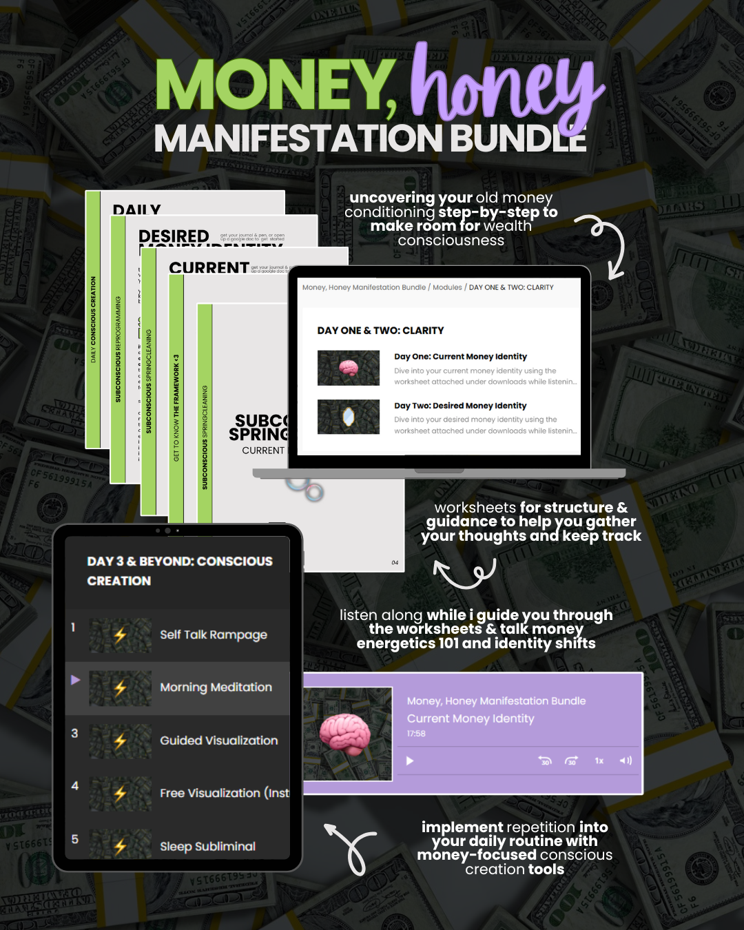 3+ day mini-course bootcamp with a bonus vault of money-focused conscious creation tools helping you reprogram old money stories with guidance helping you step into an upgraded money identity that aligns with wealth being your baseline.