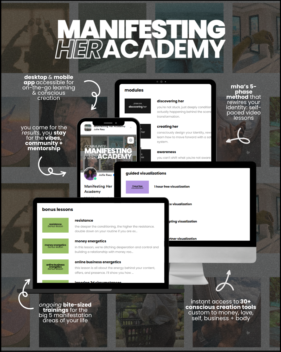 monthly reality-shifting subscription where you gain access to my signature proven 5 phase manifestation method, 30+ custom conscious creation audio tracks, 10+ bonus manifestation lessons, and a community for Q&A and vibez.